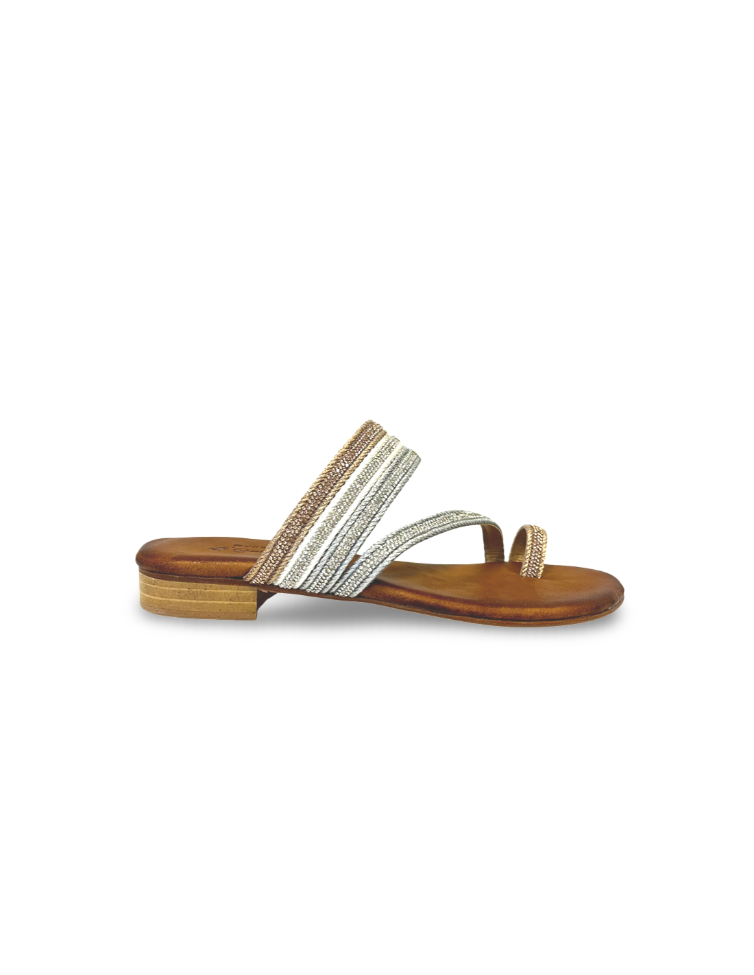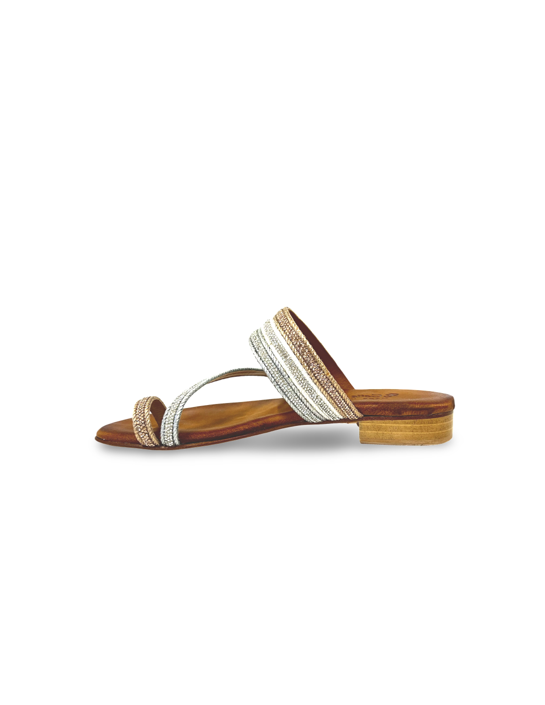 Nives è una ciabattina infradito dallo stile elegante e naturale, arricchita da piccoli elementi decorativi multicolore nelle delicate tonalità del cuoio, bianco e argento, che valorizzano il design con un equilibrio raffinato di luce e materia.