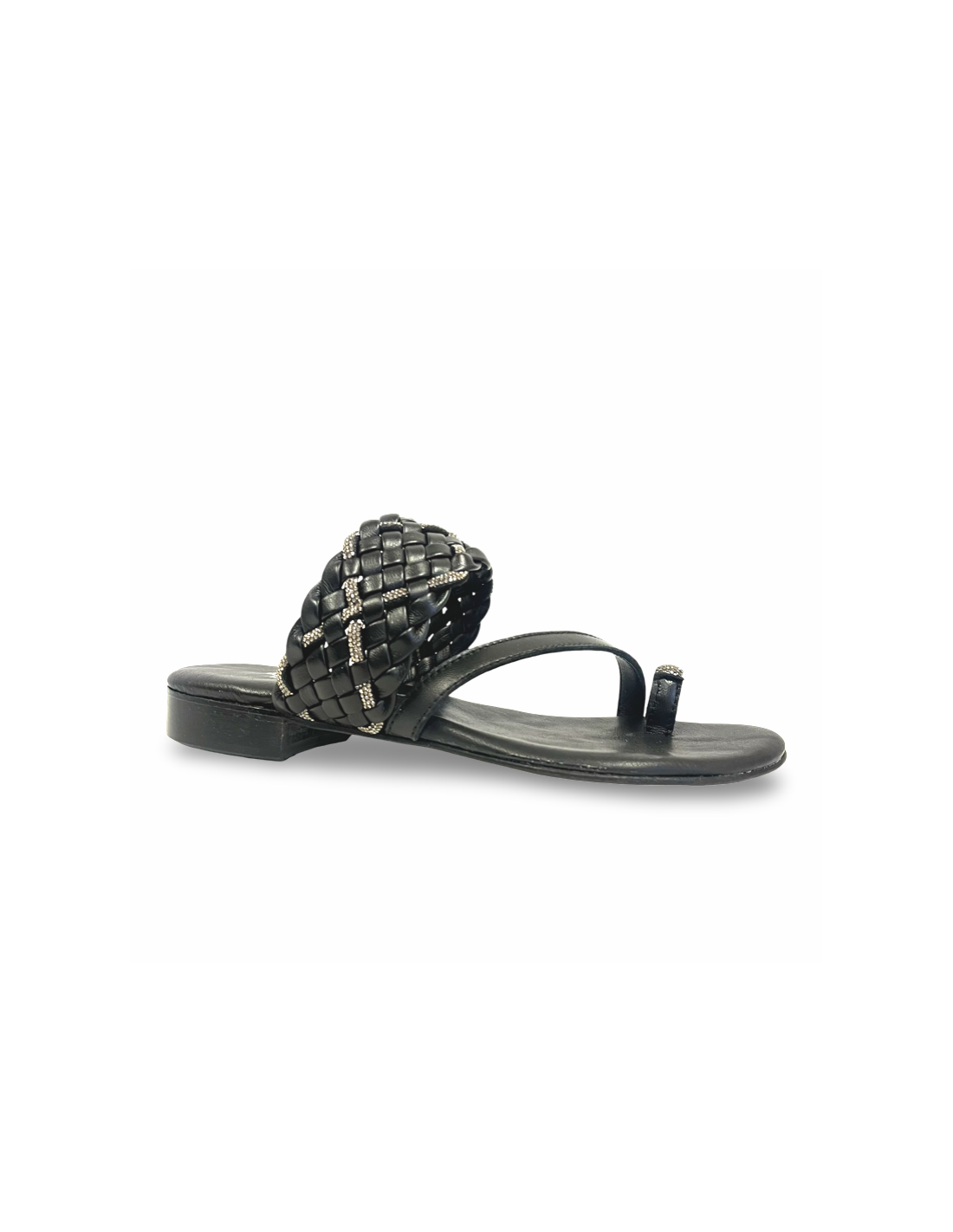Il sandalo infradito Aria in pelle nera si distingue per un’eleganza decisa e contemporanea. La tomaia in vitello nero è valorizzata da una treccia intrecciata tono su tono con inserti argento e da discreti dettagli mignon in finitura argento, che creano un contrasto raffinato e luminoso. La suola in vero cuoio color nero assicura solidità e resistenza, mentre il sottopiede in vera pelle, morbido e confortevole, accompagna il piede con naturalezza per tutta la giornata.