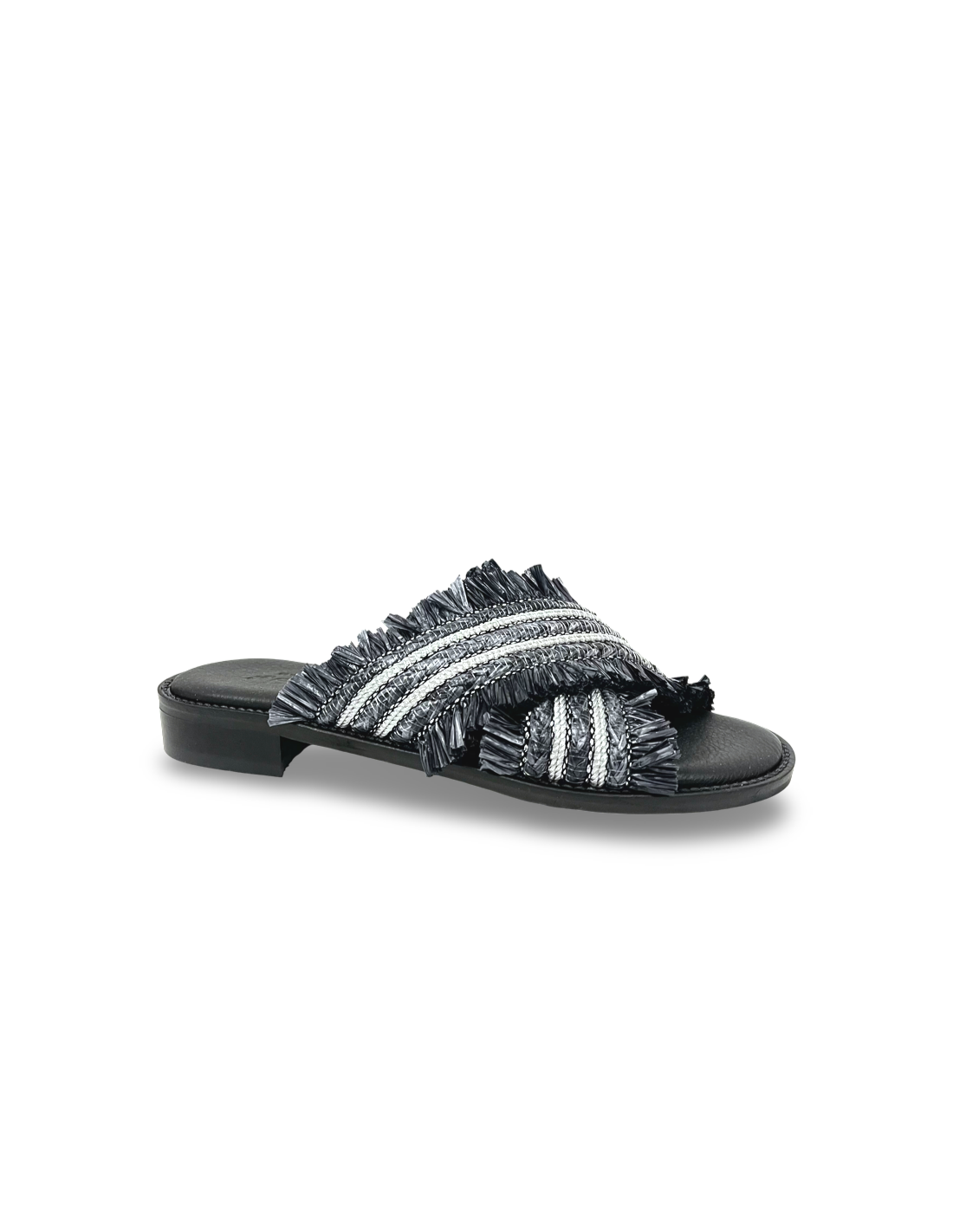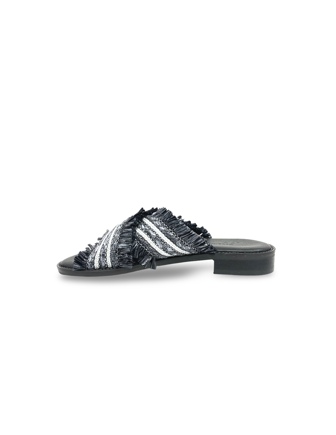 Pia è una ciabattina dallo stile fresco e femminile, caratterizzata da una raffinata tomaia intrecciata in rafia impreziosita da strass luminosi e delicate frange. Il tacco basso da 2 cm garantisce stabilità e comfort, rendendola ideale per essere indossata tutto il giorno. Il sottopiede morbido accoglie il piede con naturalezza, offrendo una piacevole sensazione a ogni passo. Un modello versatile e ricercato, perfetto per aggiungere un tocco chic sia ai look estivi più casual che a quelli più curati.