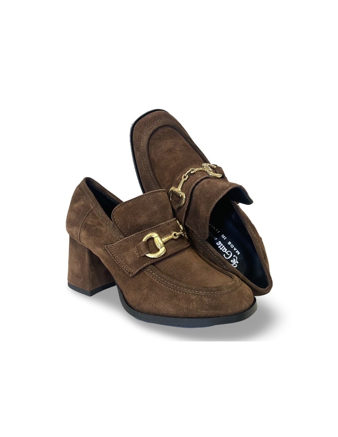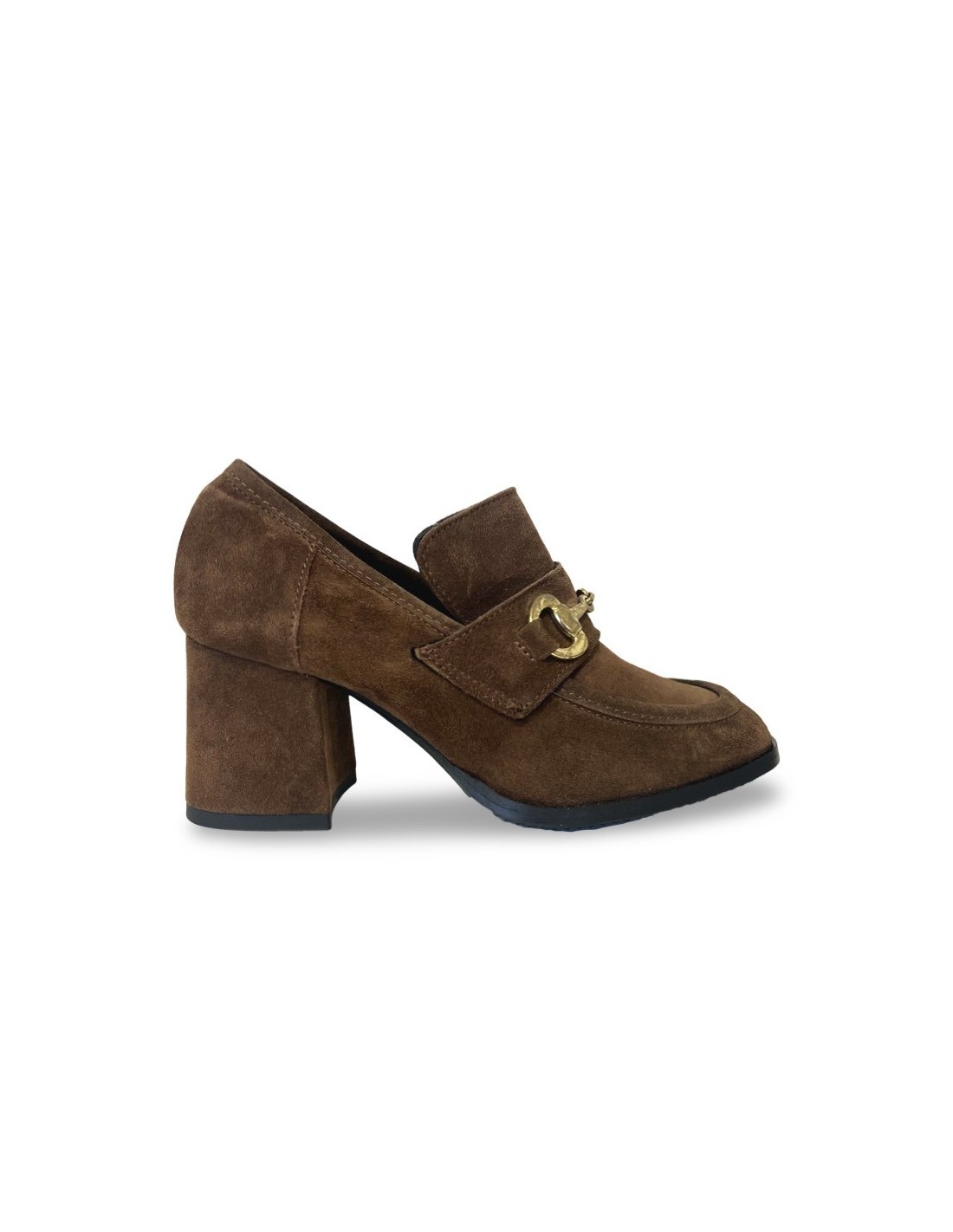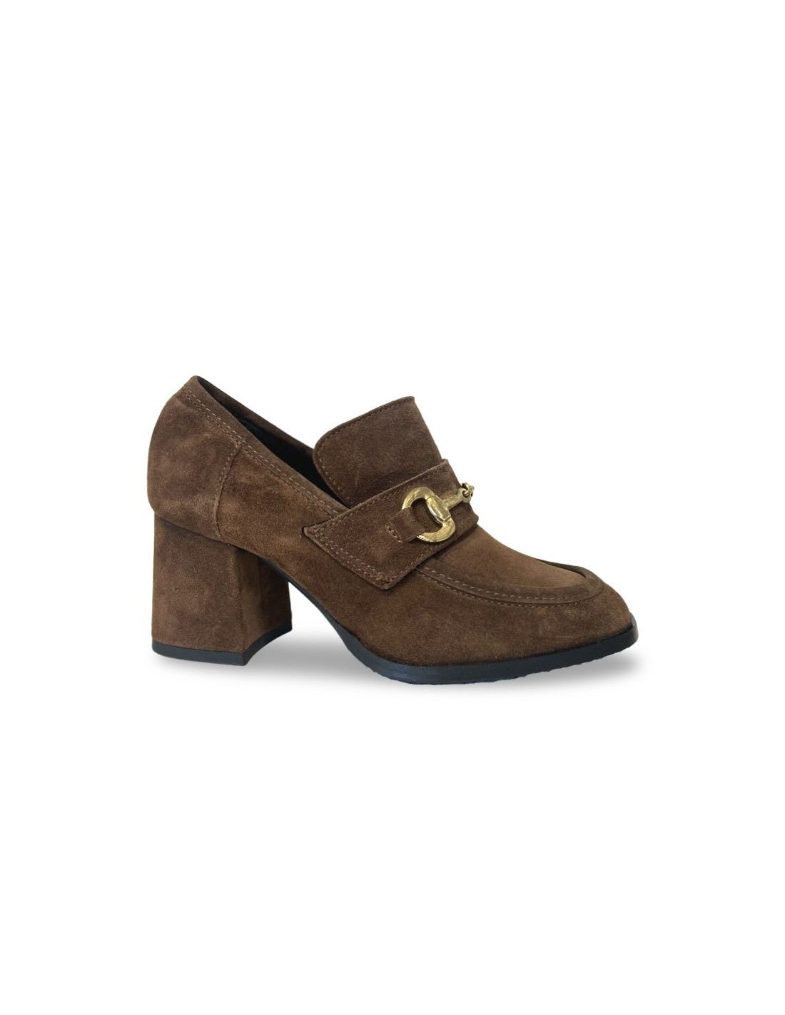 Dal fascino senza tempo, questo mocassino retrò in camoscio marrone si distingue per il suo elegante morsetto color oro anticato. Il tacco largo (6.5 cm per le misure piccole e 7 cm per le misure grandi) offre comfort e stabilità, mentre la suola in gomma assicura una camminata sicura e piacevole.