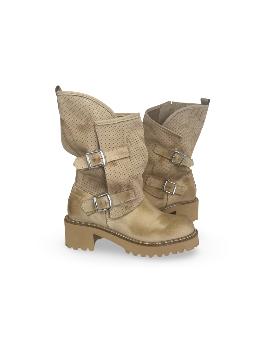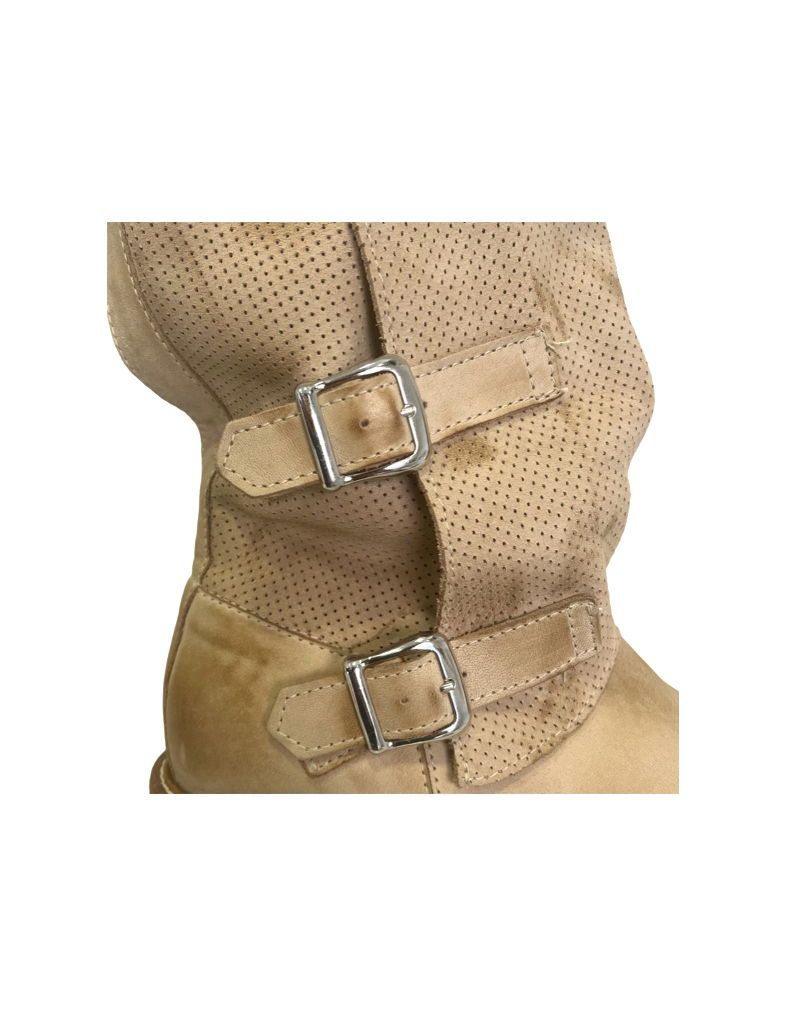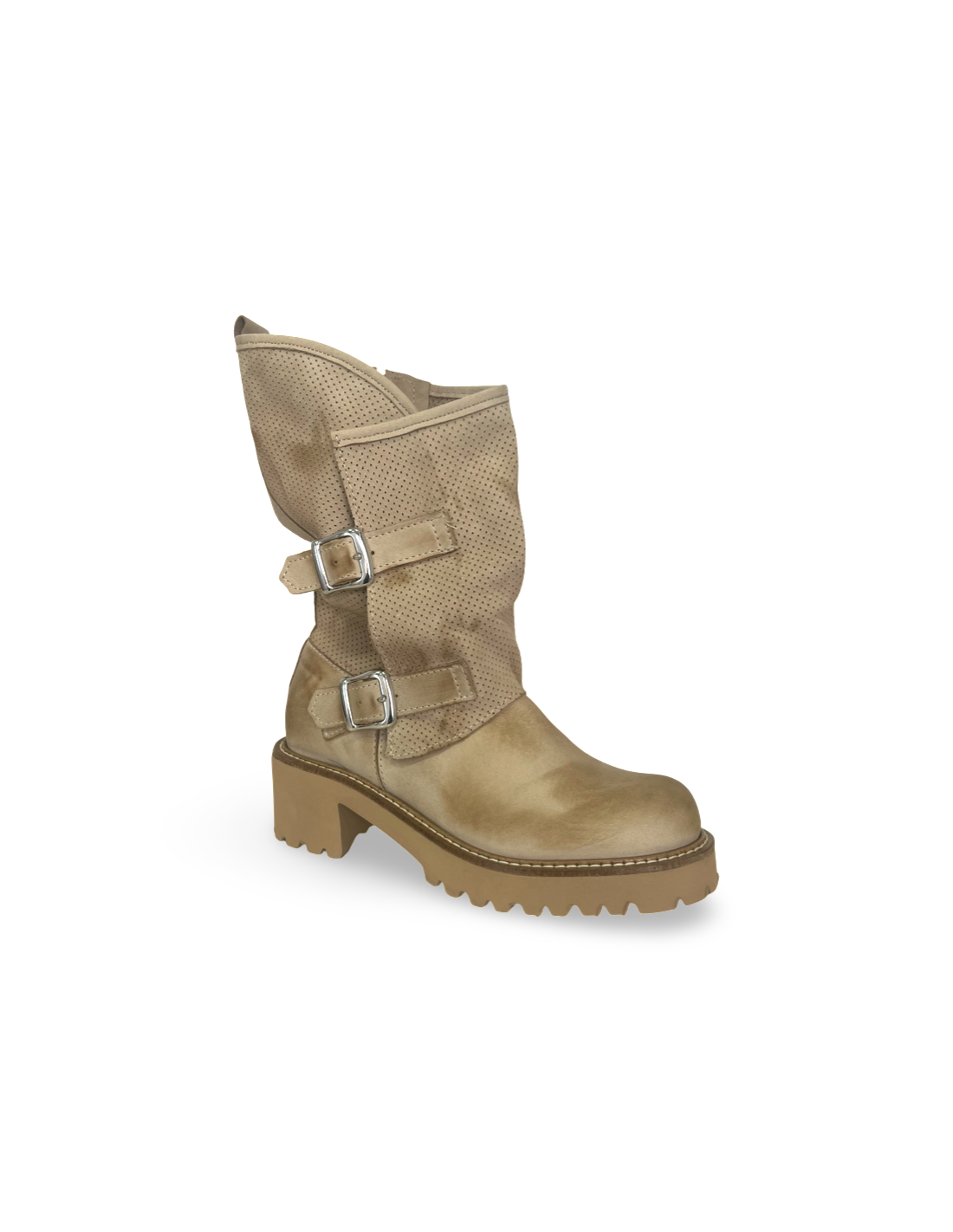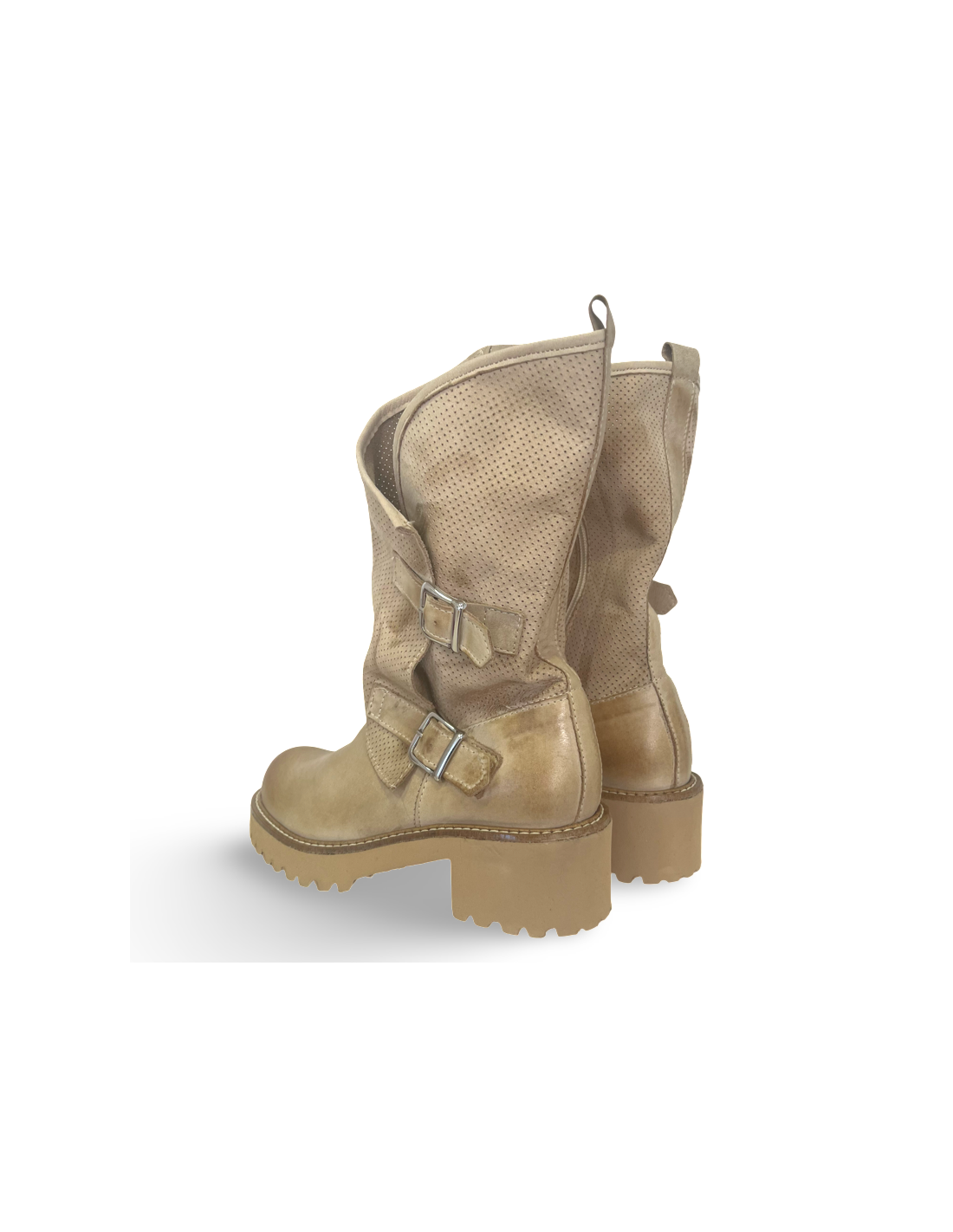 Realizzato in morbida pelle beige, questo modello conserva il suo stile grintoso grazie alle borchie decorative, ma si arricchisce di dettagli che lo rendono perfetto per la stagione: aperture strategiche o inserti traforati per maggiore freschezza.
