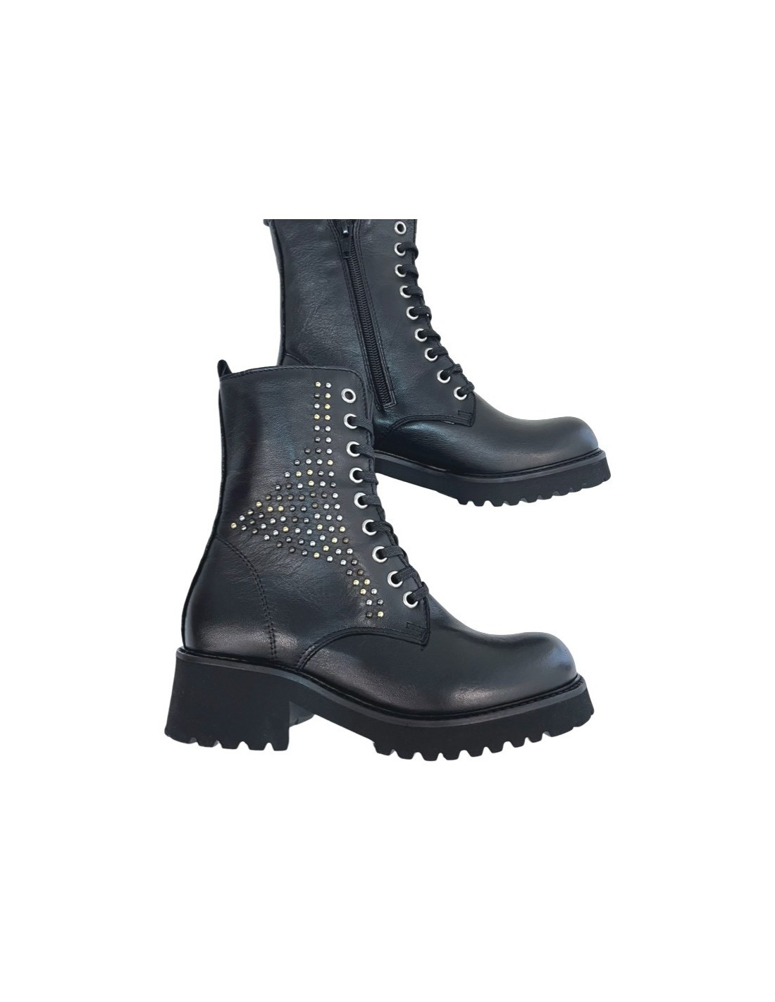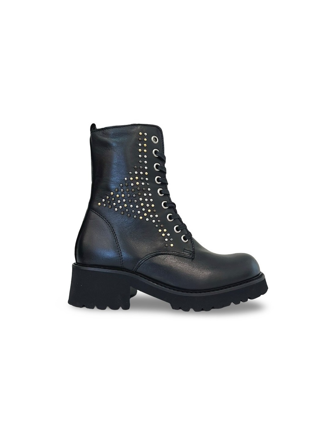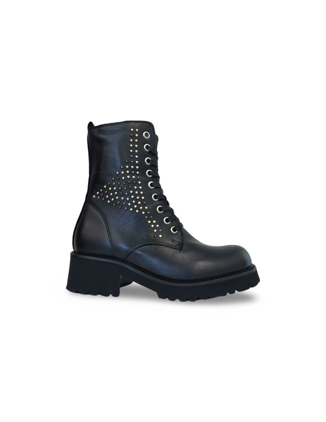 Eleva il tuo stile con l'anfibio Holly in pelle nera, un modello che unisce eleganza e audacia in un design raffinato. Dotato di 9 fori per una perfetta allacciatura, questo anfibio è caratterizzato da borchie disposte geometricamente sul gambale, che aggiungono un tocco di grinta e personalità.