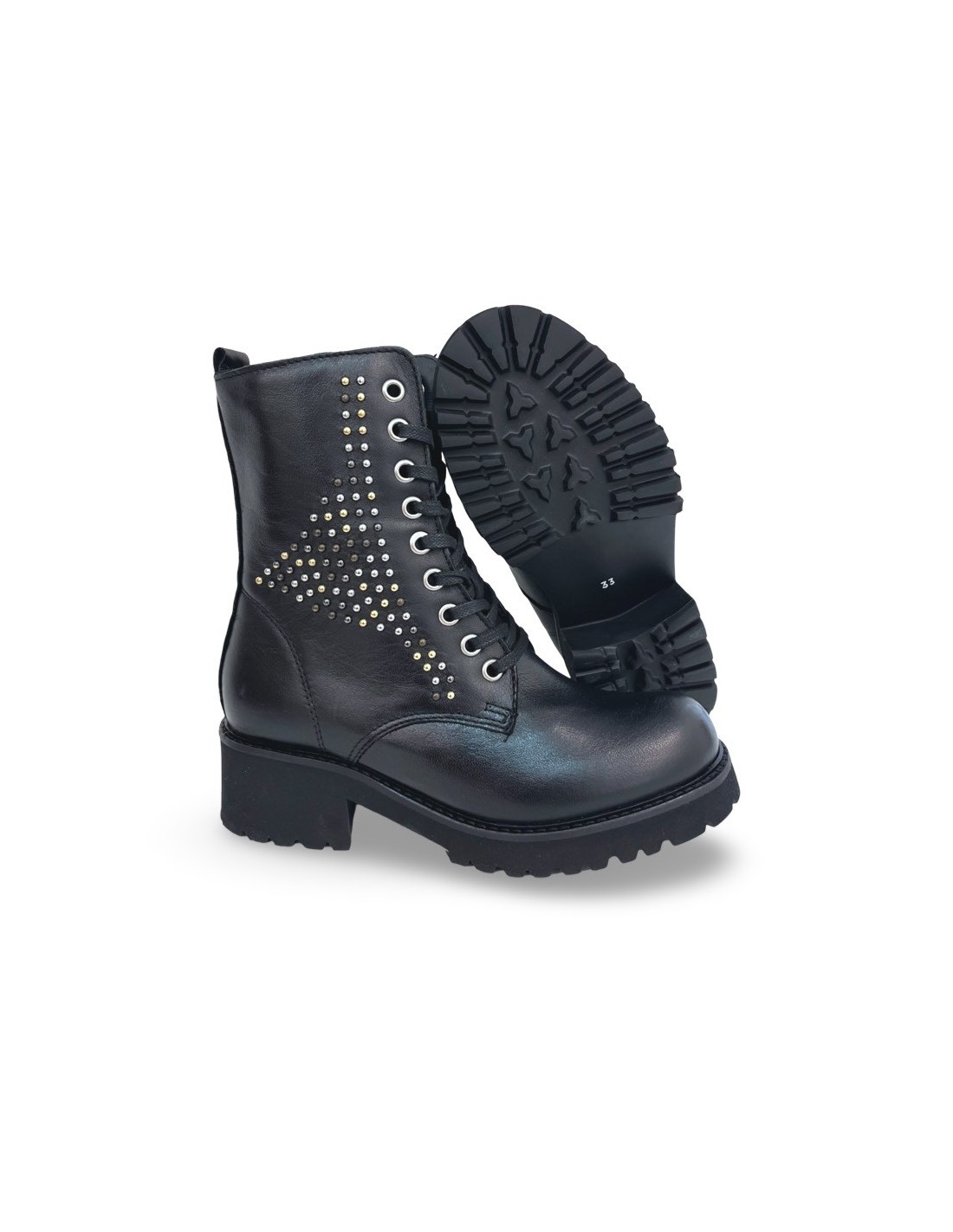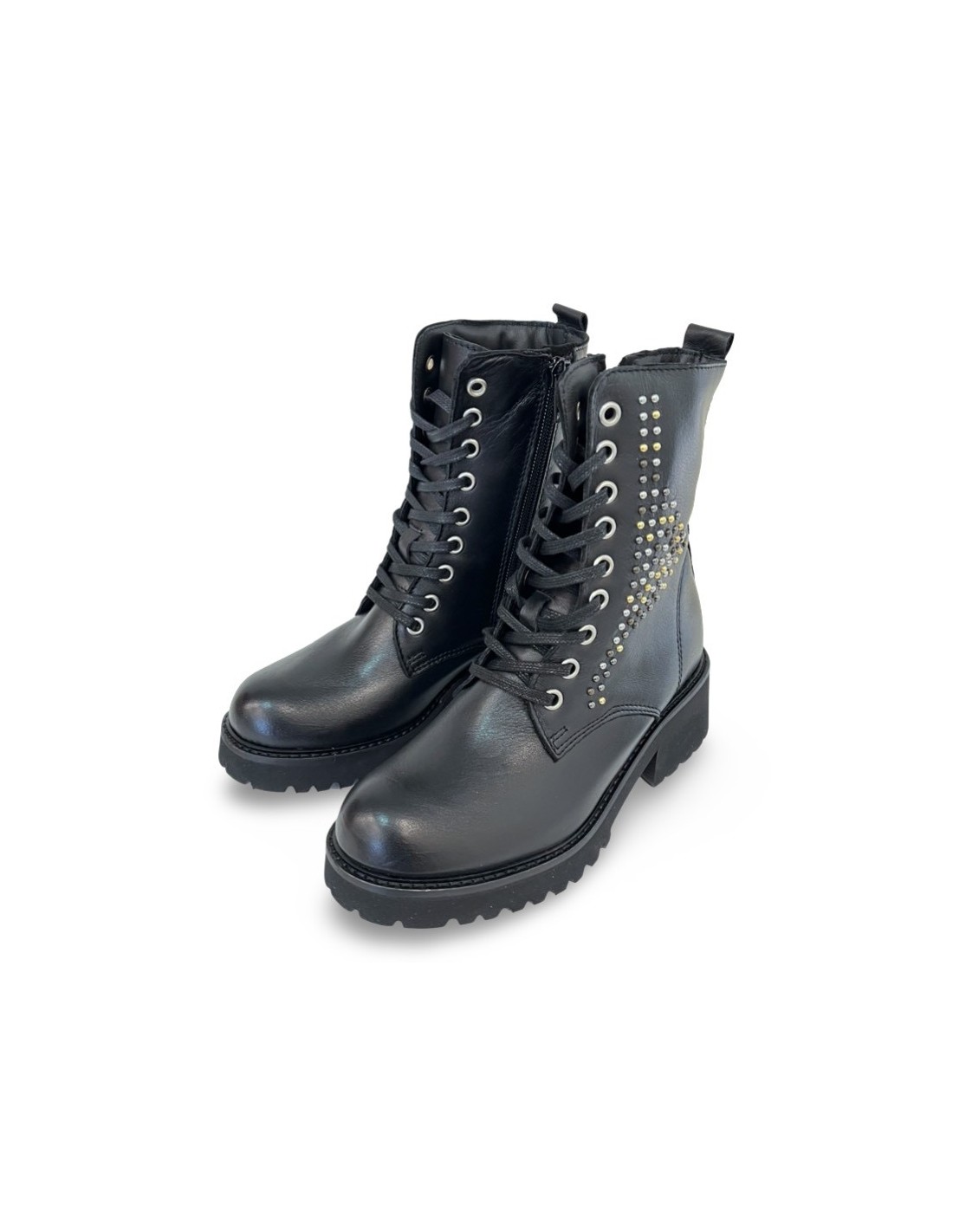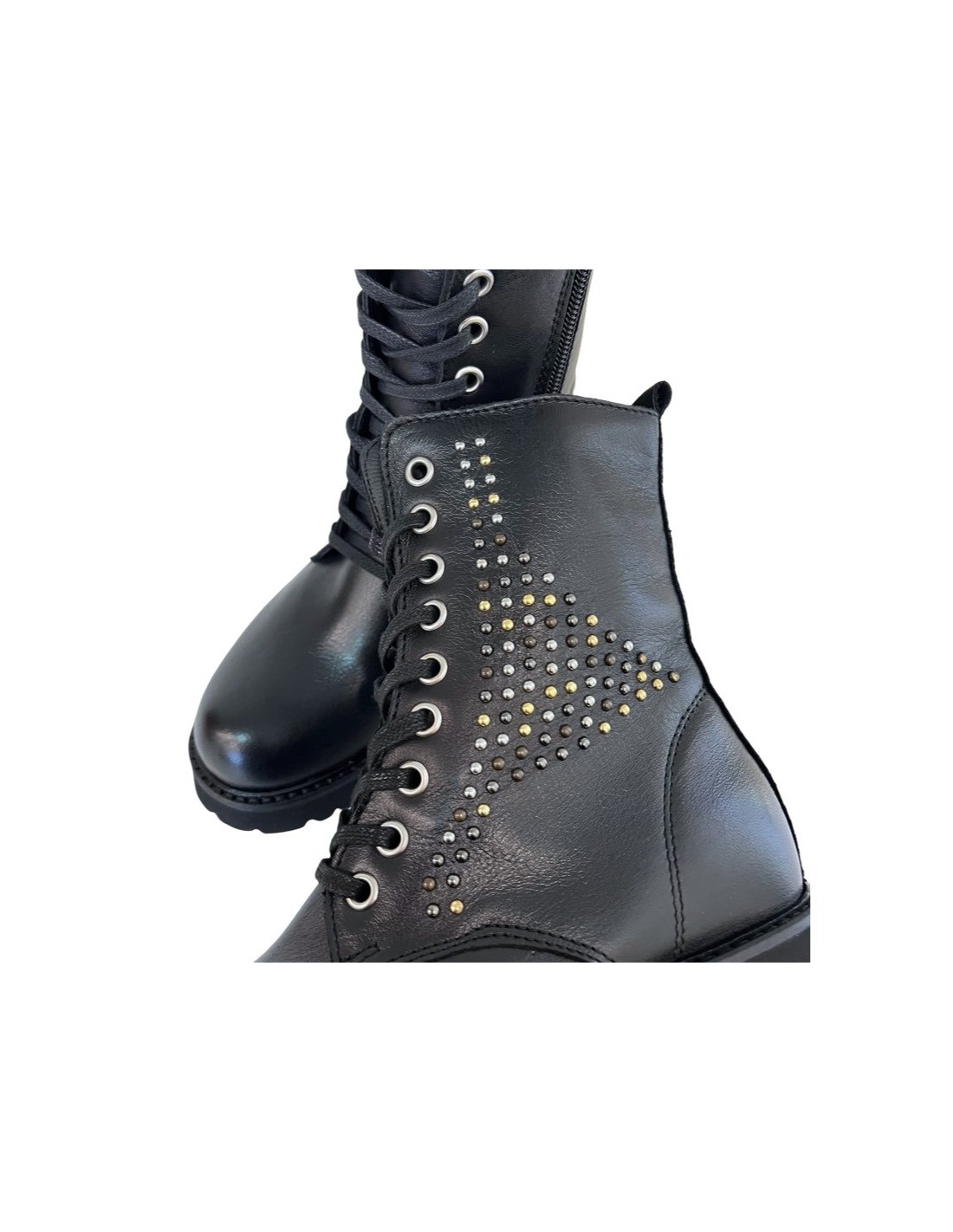 Eleva il tuo stile con l'anfibio Holly in pelle nera, un modello che unisce eleganza e audacia in un design raffinato. Dotato di 9 fori per una perfetta allacciatura, questo anfibio è caratterizzato da borchie disposte geometricamente sul gambale, che aggiungono un tocco di grinta e personalità.