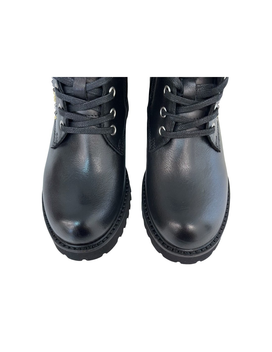 Esplora il tuo lato audace con l'anfibio Holly in pelle nera e aggiungi un elemento di design unico al tuo guardaroba.