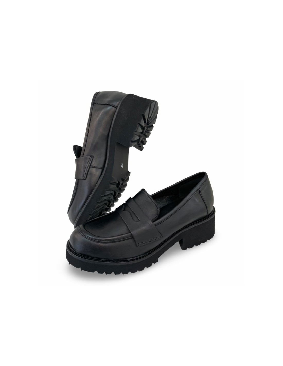 Angela è un mocassino in pelle nera dal design essenziale ma deciso. La fodera interna in pelle assicura comfort e traspirabilità, mentre il tacco largo di 4.5 cm e la suola in gomma con leggero carro armato offrono stabilità e uno stile contemporaneo.