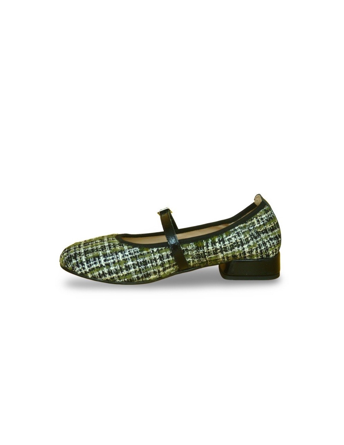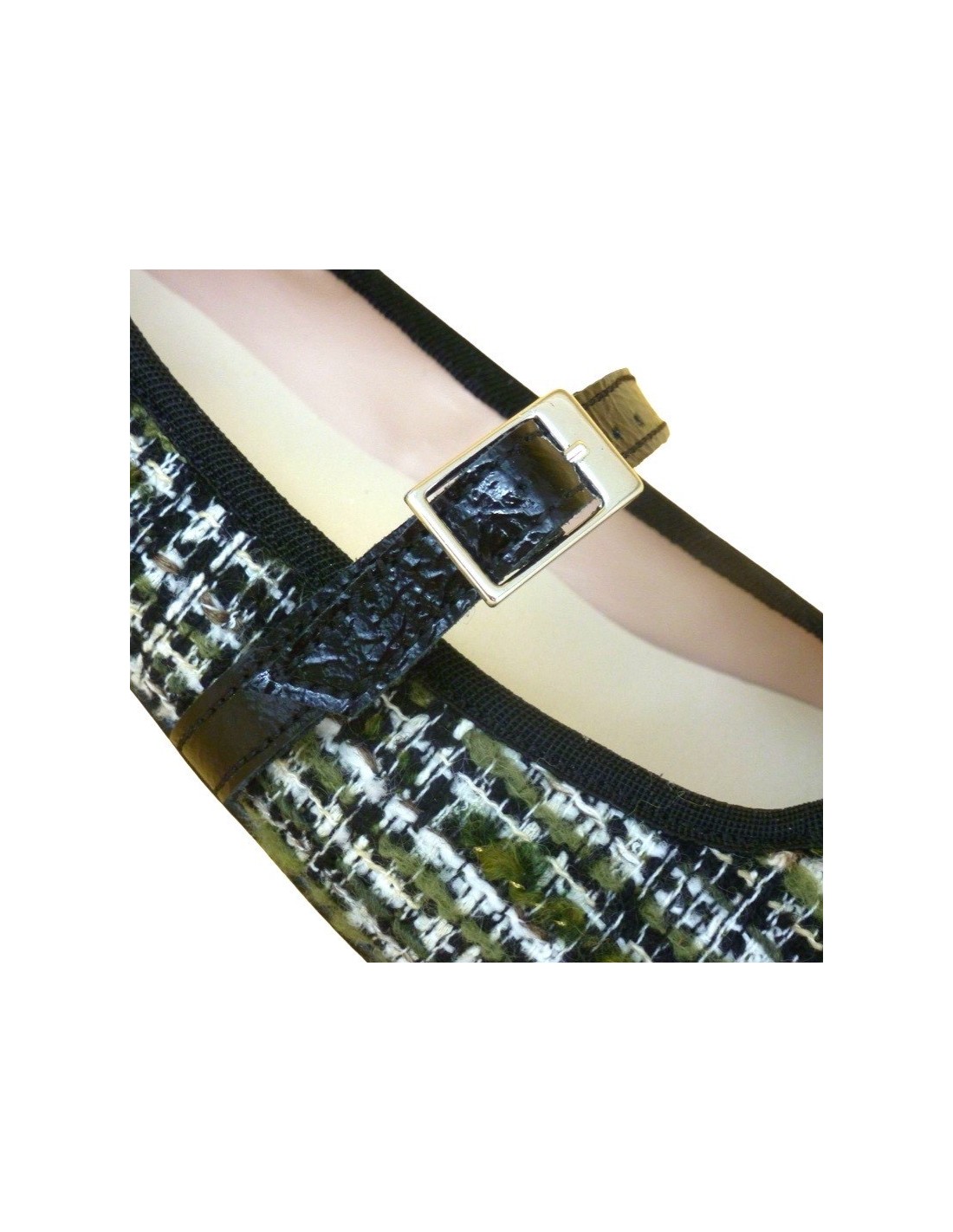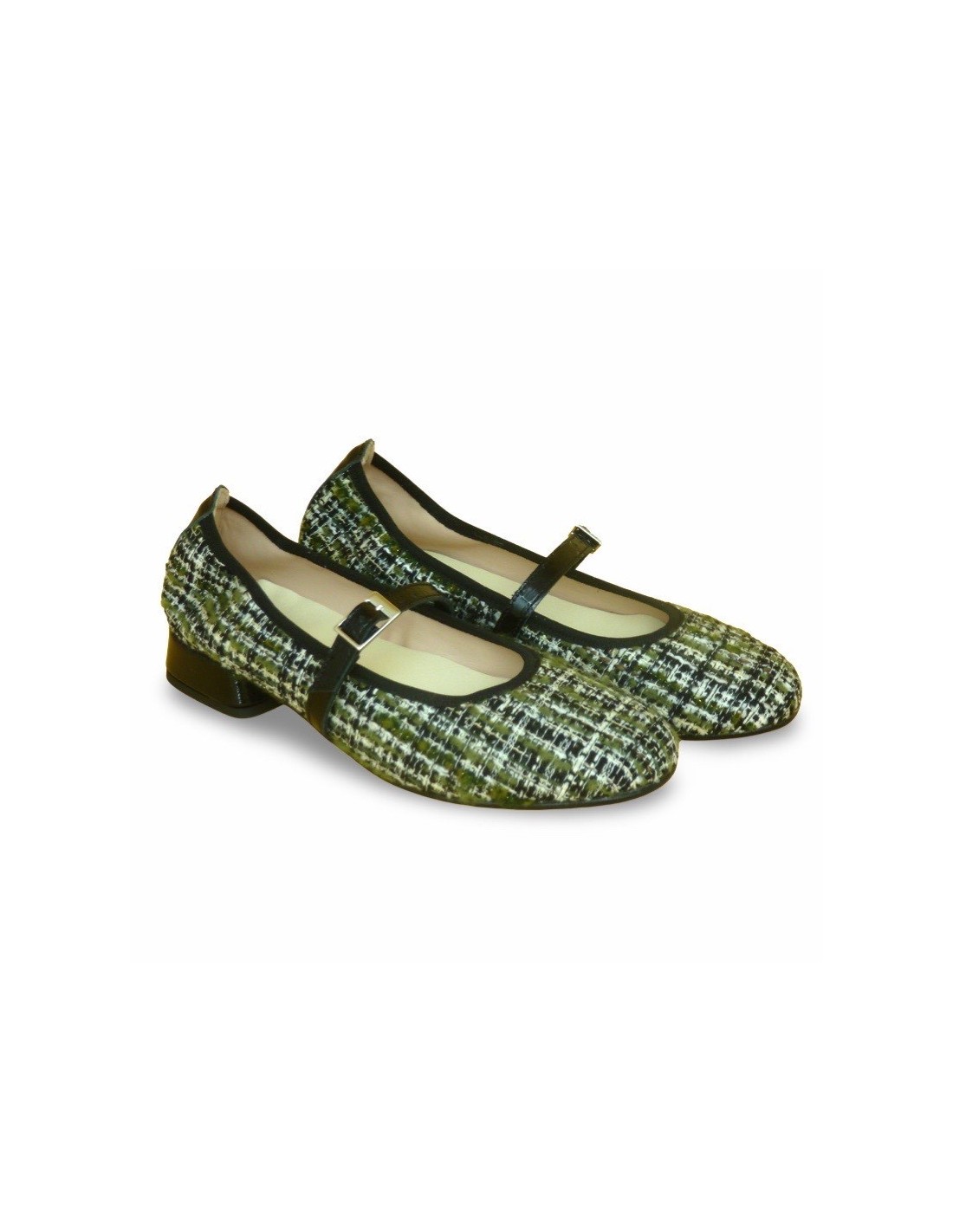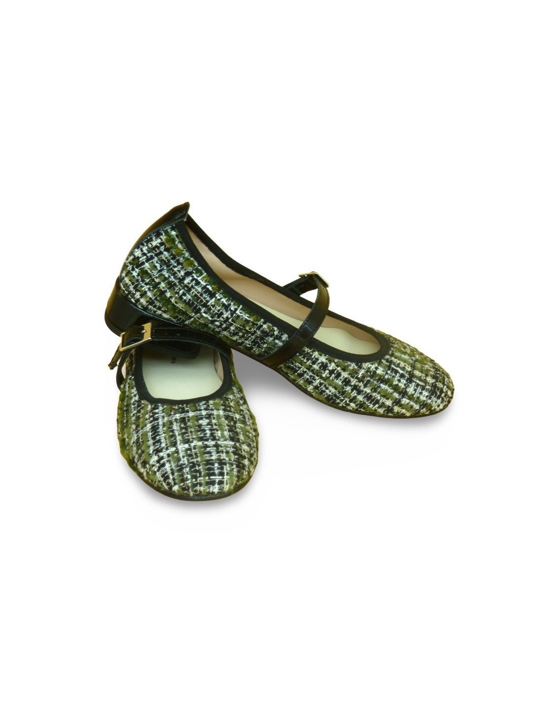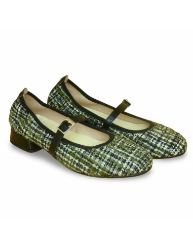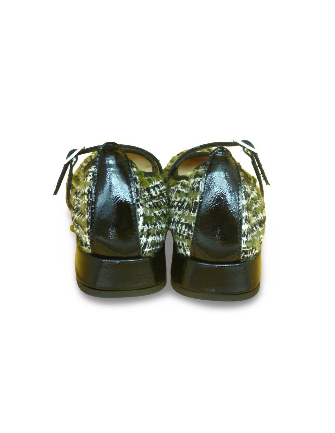 Il listino dietro è un dettaglio funzionale e stilistico che offre maggiore stabilità, mentre il tacco di 2.5 cm è un elemento discreto ma elegante, fasciato in vernice nera che risalta per la sua lucentezza, creando un contrasto raffinato con la morbidezza del tessuto muschio.