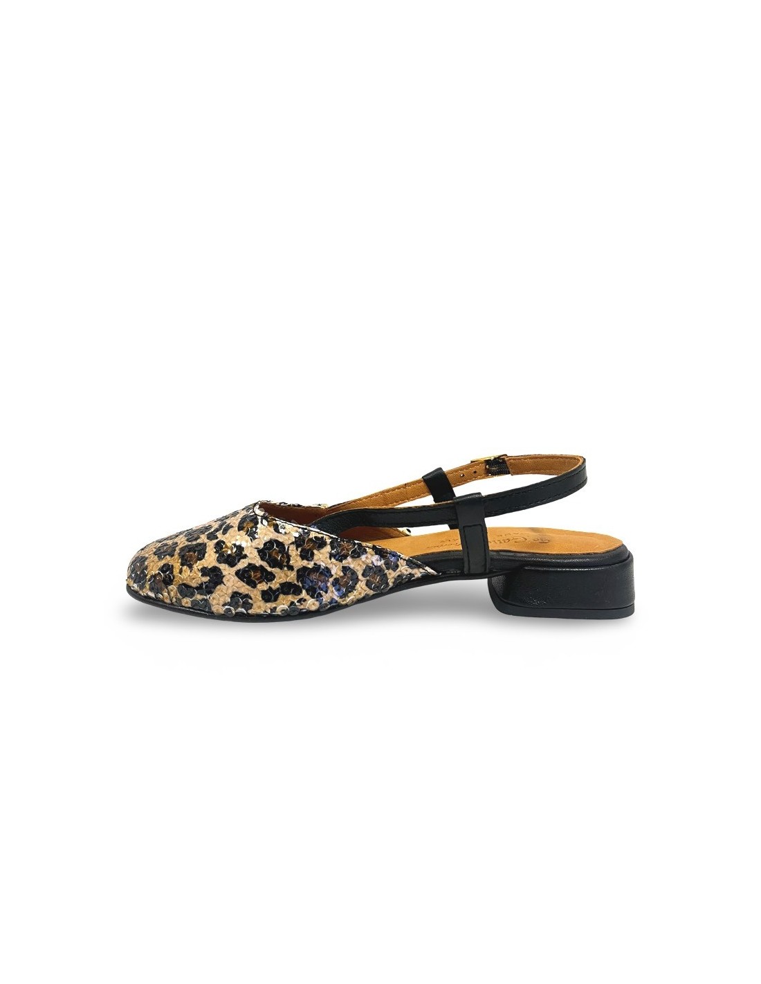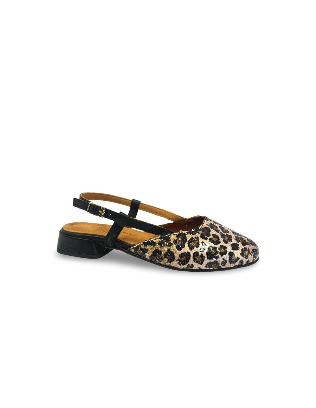 Molly è una slingback dal fascino intramontabile, pensata per chi ama uno stile sempre di moda e sempre attuale. Realizzata in raffinato tessuto di paillettes leopardate, cattura lo sguardo con eleganza e personalità. Il cinturino in vera pelle di vitello nera assicura una calzata confortevole e stabile, valorizzando la linea del piede. Il tacco fasciato in pelle dona slancio con classe, mentre la suola in tunit garantisce resistenza e praticità. Un modello versatile e sofisticato, perfetto per completare sia look quotidiani che outfit più ricercati.